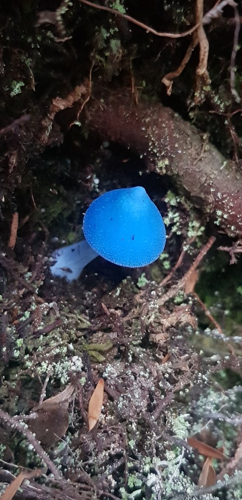 Although I was a bit scraped and had a struggle to move forward, it felt so good! The birds were singing; tui and bellbirds while fantails followed me fluttering in the trees. The cloud was lifting to reveal a light blue sky scattered with grey. Every now and then I’d stop and look through the bush to the forest floor. What fungi was to be found? Any interesting plants or other things to look at? It’s amazing what you see when you stop to really look. I was not disappointed.