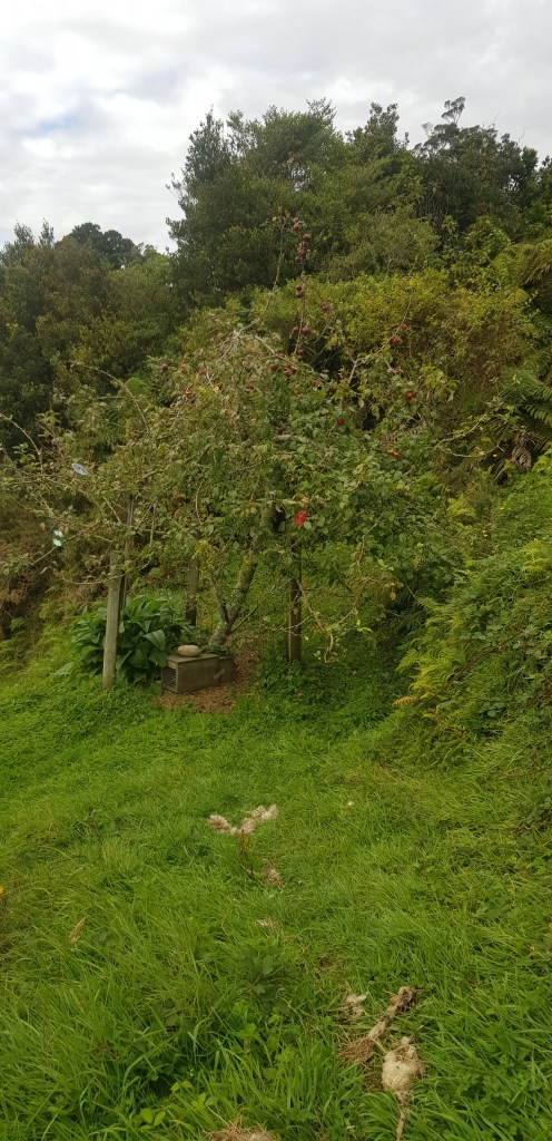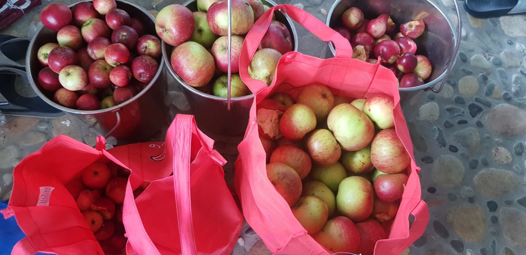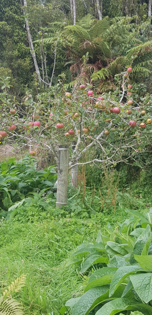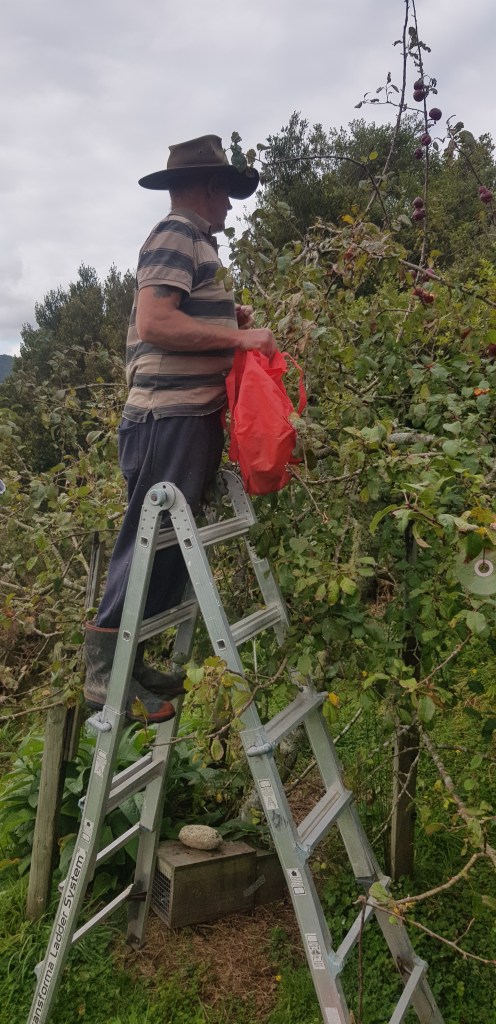 This afternoon we wanted to strip the apple trees in the orchard. I love birds but the wax-eyes were creating havoc with our apples and if we wanted any they would need to come off the tree. It was the whole team down to help. Laurie and Kayden brought the ladder down and we picked every last apple off two trees.