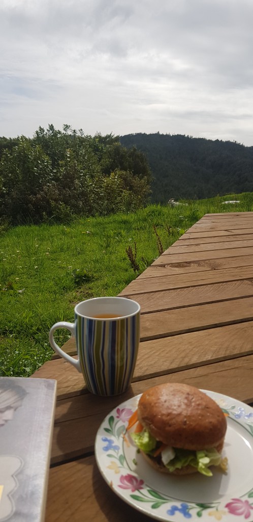 By the time I stopped for lunch, the sun was out and I had cabin fever. I must admit to enjoying a reasonably tidy house but I’m not over excited about house work! I made a roll, poured a mug of tea, grabbed my book and headed out into the sun for a break!