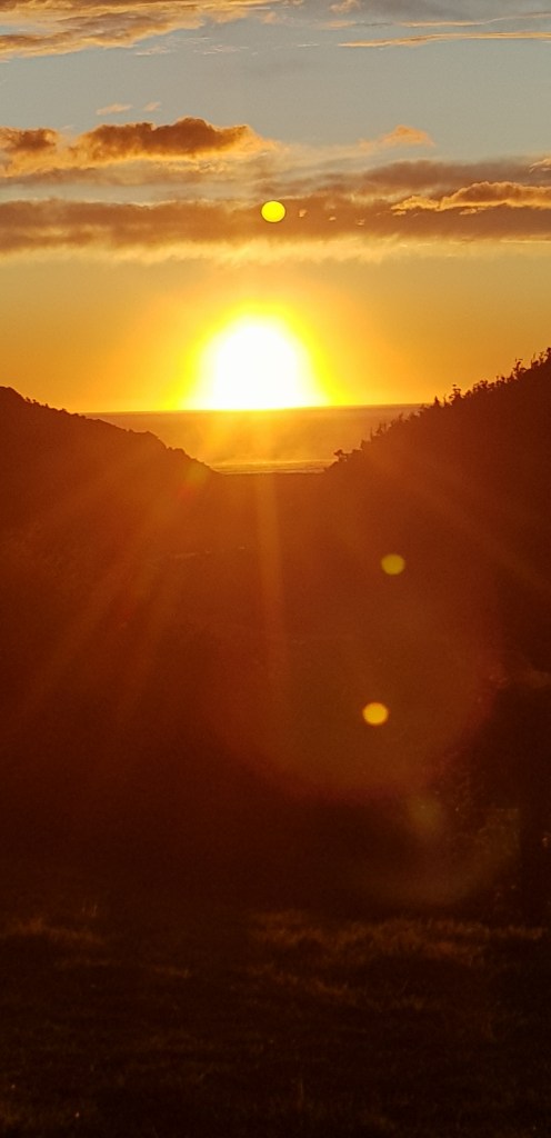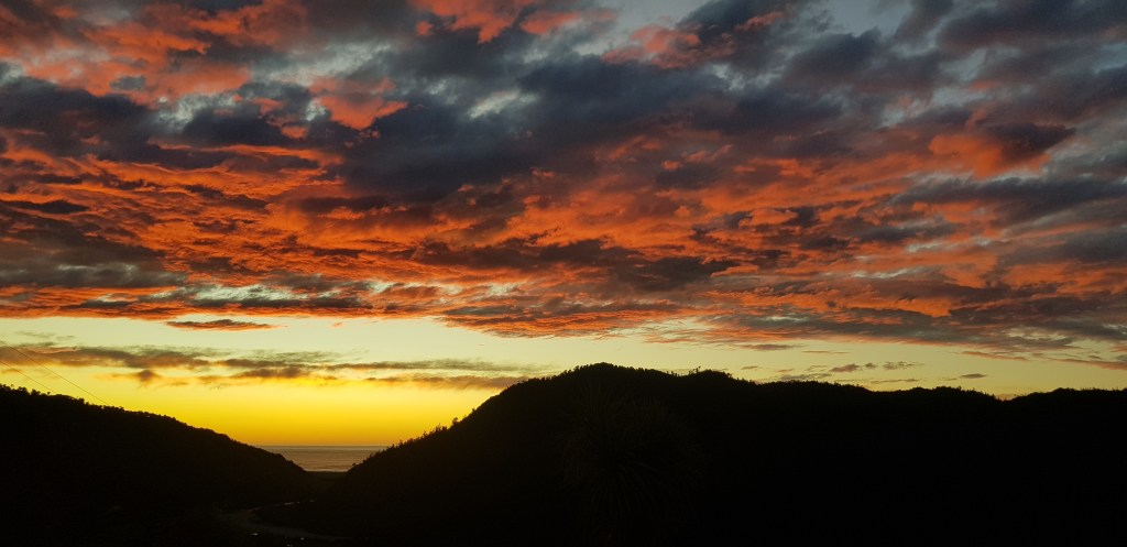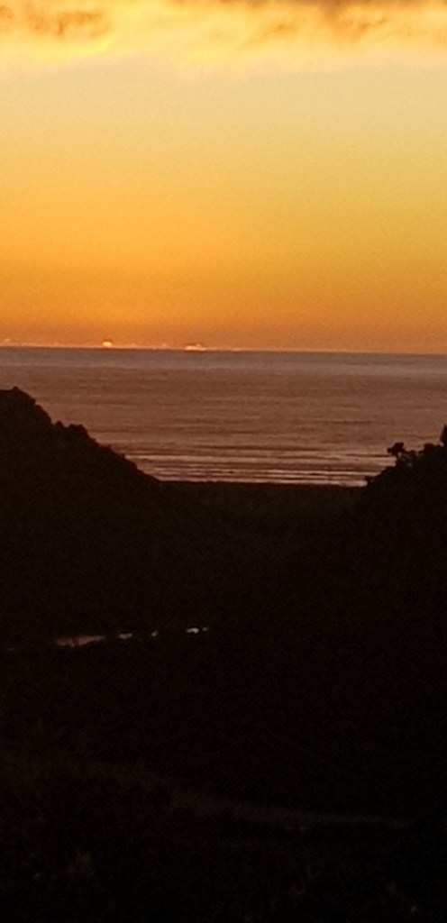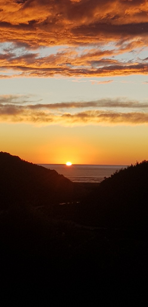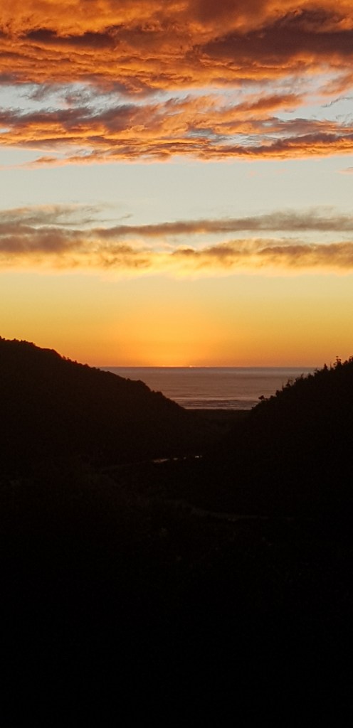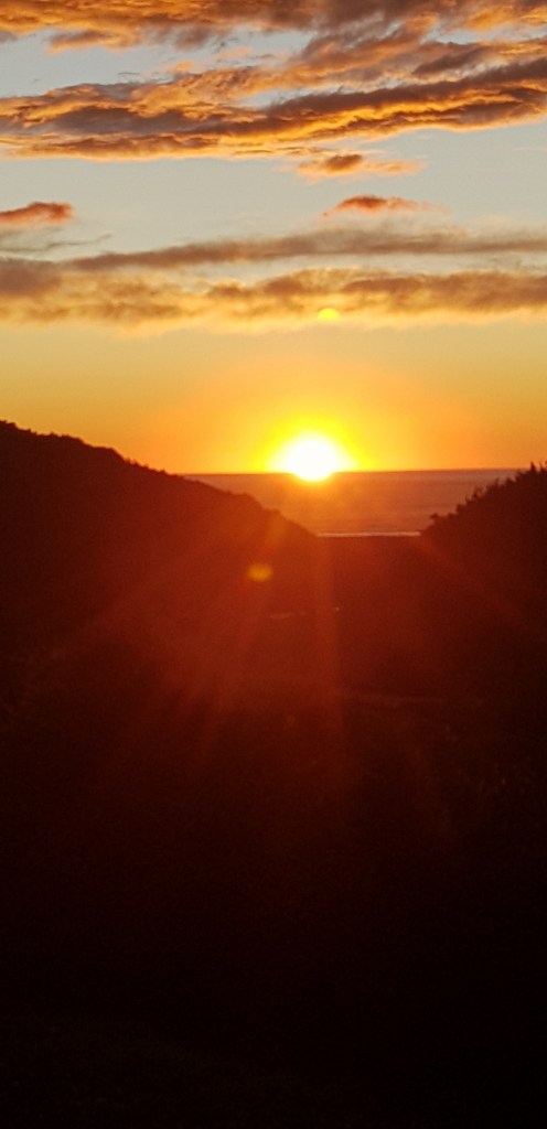 I’m starting backwards tonight! Twice each year for about three weeks the sun sets directly in the gap between the hills on each side of our view to the sea. Tonight’s sunset was not disappointing in its grandioseness. I stood out on our deck and took a photo every 15 minutes until the sun was gone. The colours of the clouds was indescribably beautiful, it’s a struggle to find adjectives that give it justice. I’ll just let the pictures paint a thousand words …