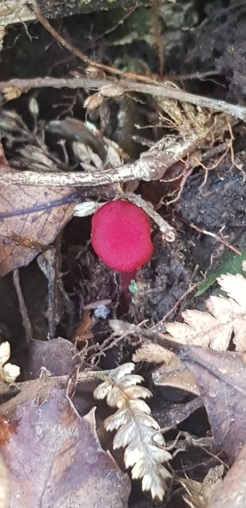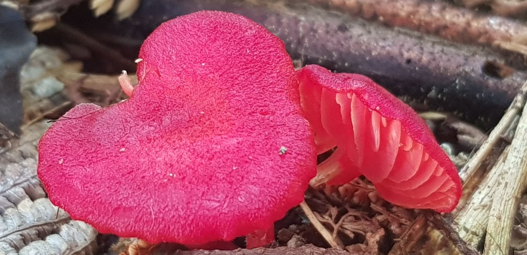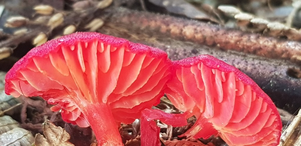 Today was a day for the reds! It’s interesting how quickly the Entomola hochstetteri (blue mushrooms) have become so common! I have had so many people message me saying they would love to see one, and here was I hungry for another colour. I think there is a message about human nature in there!! Anyway I was showing Laurie some chainsawing that I had done a week or so ago to clear some scrub for a new fence line. We were chatting and he had just given me some tips for cutting down some small trees when lo and behold! There at our feet was the reddest of red pair of mushrooms. I quickly came back to the house to get a camera and on closer inspection discovered an entire family in one very small area. It so totally made my morning – I was stoked. I hope you like them too!