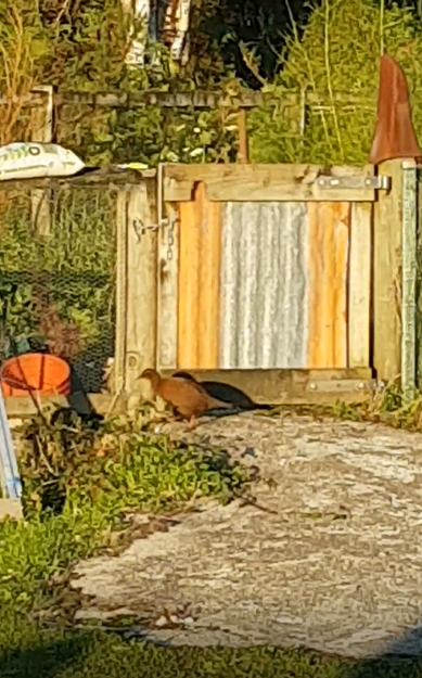 Last night there was a weka in the garden, not good! We accept we live in an environment where weka are a dominant species, however to live side by side and in harmony with them there are some steps that are required. Weka are opportunists, they will never miss an open door or gateway, feed bucket or anything else that they think will benefit them. We have had them in our vehicles, our house and our gardens. The have helped themselves to animal food, fruit in the orchard, eggs in the chook house and they readily make messes everywhere they go. They are so cunning; I have watched them wait underneath the dog’s kennels and hope for a biscuit to drop through the slats. If it does they grab the biscuit in their beaks and run like crazy. It is kinda funny, but drives the dogs spare! Weka in the garden will dig up any plants and eat the produce, including pecking holes in pumpkins! I got the weka out, but was puzzled how it got in! We have a fence around the garden that is designed to keep the weka out, so something was amiss. Laurie found out while he was having breakfast this morning. I had a pile of hay bales, stacked and covered with a tarpaulin, the weka climbed to the top of the hay, jumped over to the top of the fence, walked along the fence railing and jumped onto the compost and was then in the garden!