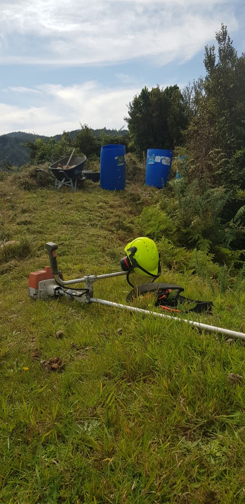 It’s funny how a simple idea becomes a complex mission! I went to check the strawberries and the empty drums. I decided that before I filled the drums I should clear the ground. This job was too big for hand pulling, so out came the scrub cutter. It needed fueling and then it was time to get the grass, gorse and weeds down. I did that BUT next door to the strawberry patch are the raspberries that were also terribly overgrown with weeds! I couldn’t scrub cut the fence line so I had to hand pull them. Kayden came to help me, so he went on the other side of the fence AND before I knew it there we were, weeding the raspberries! As I write this in the evening light the job is done, the strawberry barrels have been situated on flat ground and the stones have been put into the barrels ready for stage two – dirt!