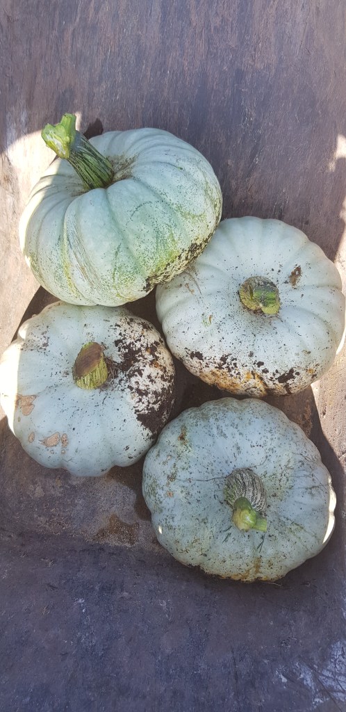 The herb garden will still be there tomorrow! I weeded a small portion of the vege garden and harvested four beautiful pumpkins.