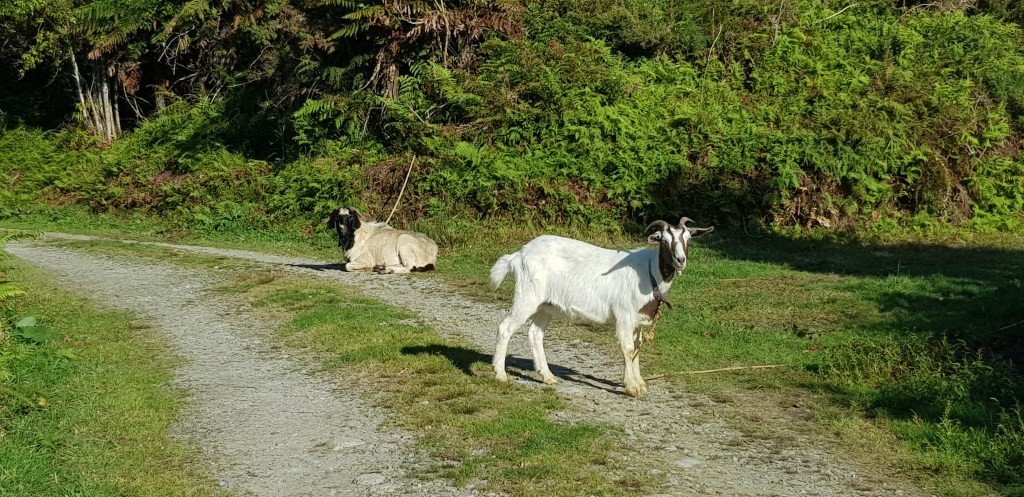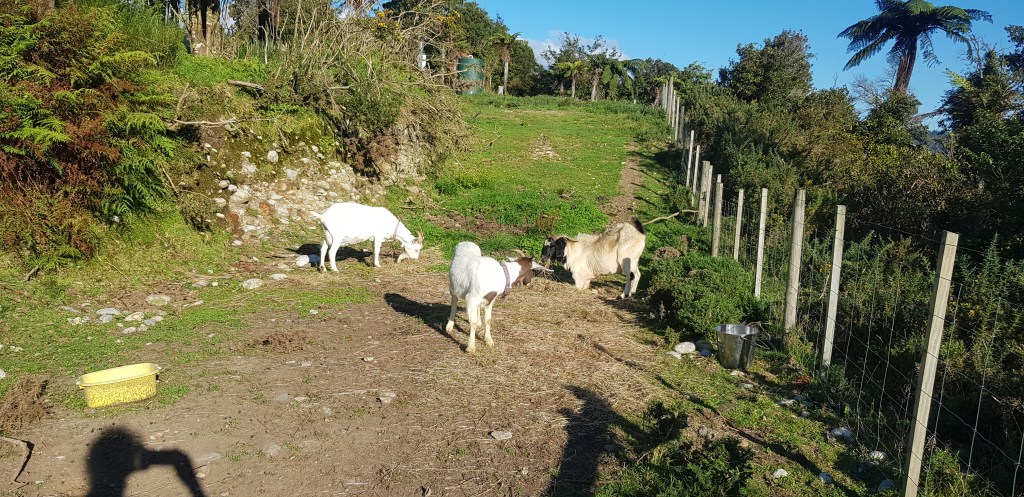 Oh! Here are the promised photos of Ollie and his girls: Willow (big white goat) and Moon (with the coloured face).