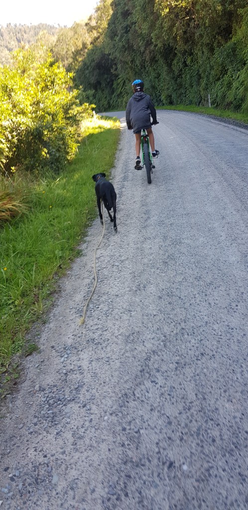 Kayden asked if we could go for a bike ride today. Seemed like a good idea, so we got organised. Part of the challenge of living on a hill is that there is not a lot of flat ground for a decent bike ride. We decided to bike to the river from the bottom of our hill. Kayden biked down the hill and I drove down with my bike on the back of the ute. We thought the run would be good for Petra so she started with a run down the hill. We all met near the mail box and set off.