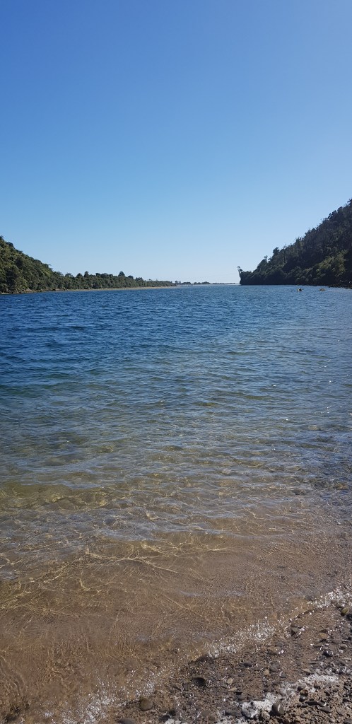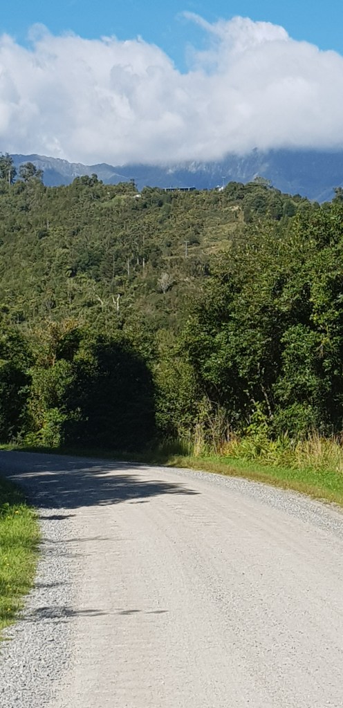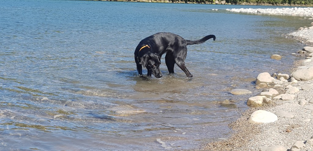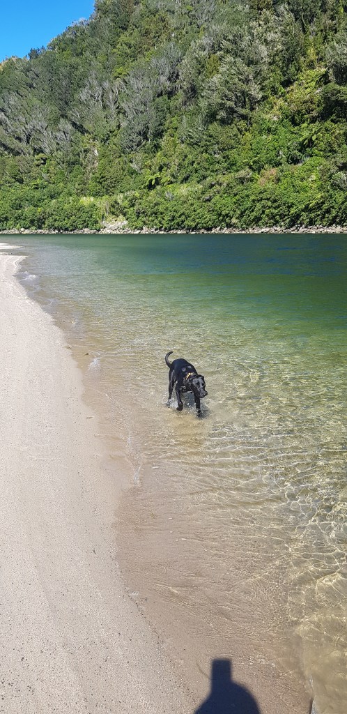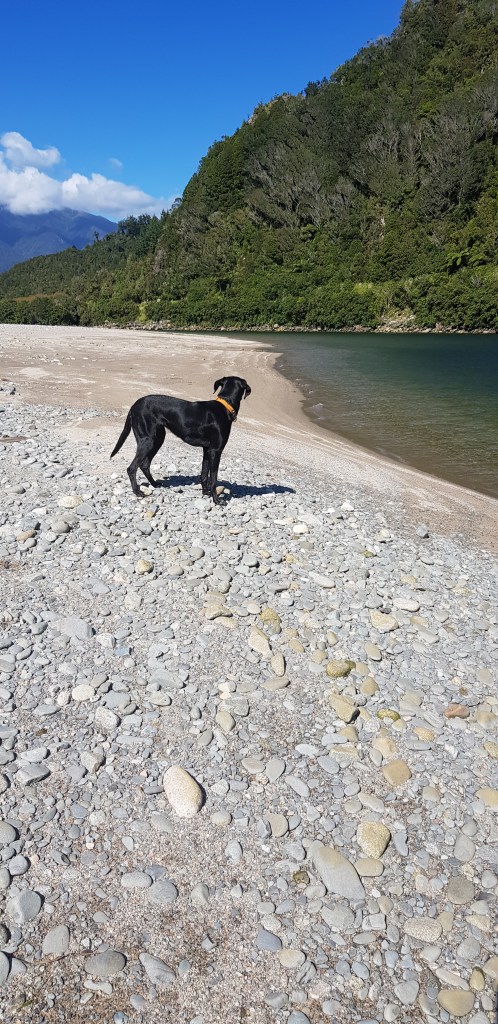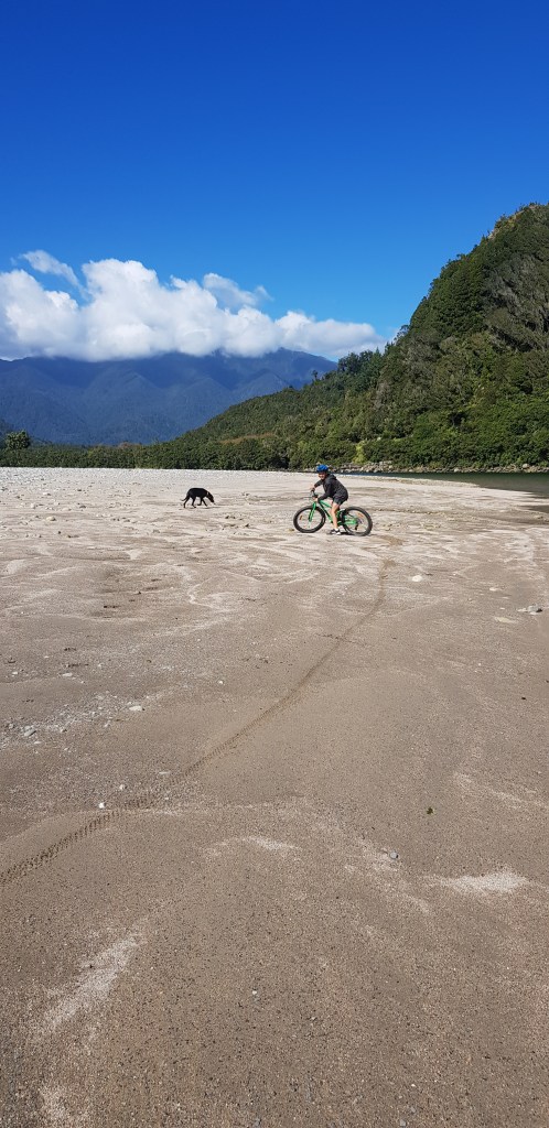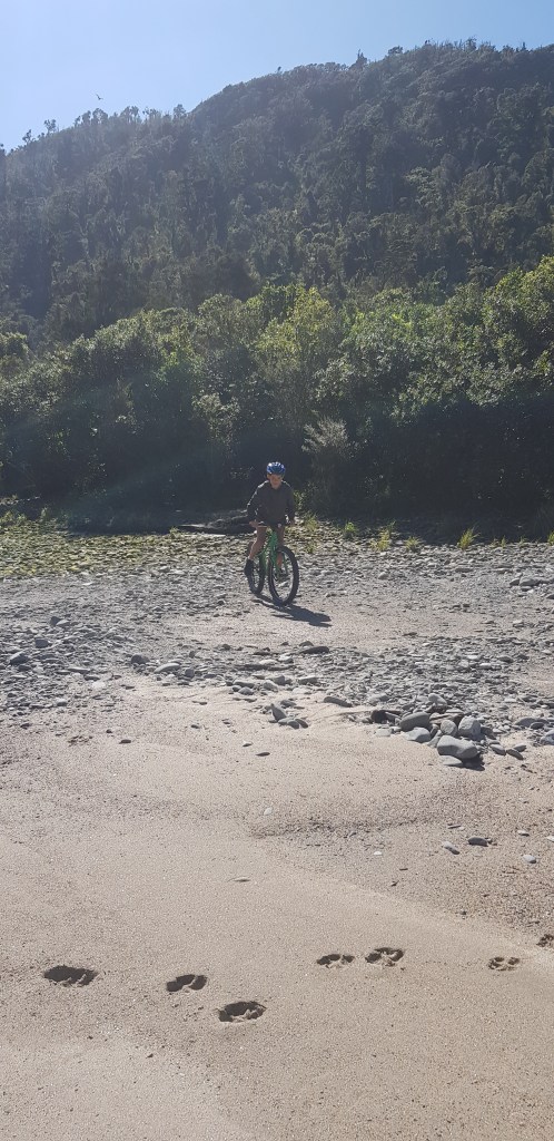 Not far from the turn off there is a track that leads down to the river. In the Spring many people come down this track to whitebait but today it was just us. We biked as far as the track allowed us to and then got off and had a bit of a walk. Petra put her nose in the water but she didn’t go for a swim.