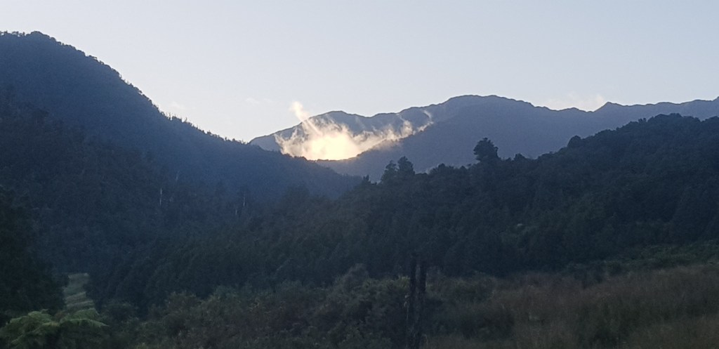 Walking round the tracks this morning was clear, crisp, cool and very invigorating. I was enthralled by the mist in the gully between the Glasgow and Radiant Ranges. It sort of hovered then rose with finger-like tendrils into the cloudless blue sky. The landscape around us is spectacular. I was thinking this morning about when I was a young girl of about 10 or 11 years. I lived with my grandparents on a sheep and cattle station in the North Island and that time molded and influenced the me I am today. I used to day dream that when I was grown up I would marry, have 6 children and live on a farm with lots of animals, (and especially have my own horse). Well … now I live my dream, sometimes I have to pinch myself as I realize that it is true! However the reality of the life-style is that it is very hard work! Today I slumped into the doldrums and struggled to get motivated. I don’t really want it but I sometimes think it would be so easy to turn on a switch and not think about if you have made enough power today, or use an electric oven and not have to light the fire or bring the wood in, or pop down to the dairy and buy a bottle of milk instead of milking the goat. That’s my dark side, fortunately it doesn’t appear all that often and I can’t entertain those thoughts as they won’t get the family fed or my chores done!