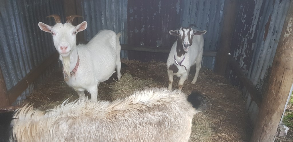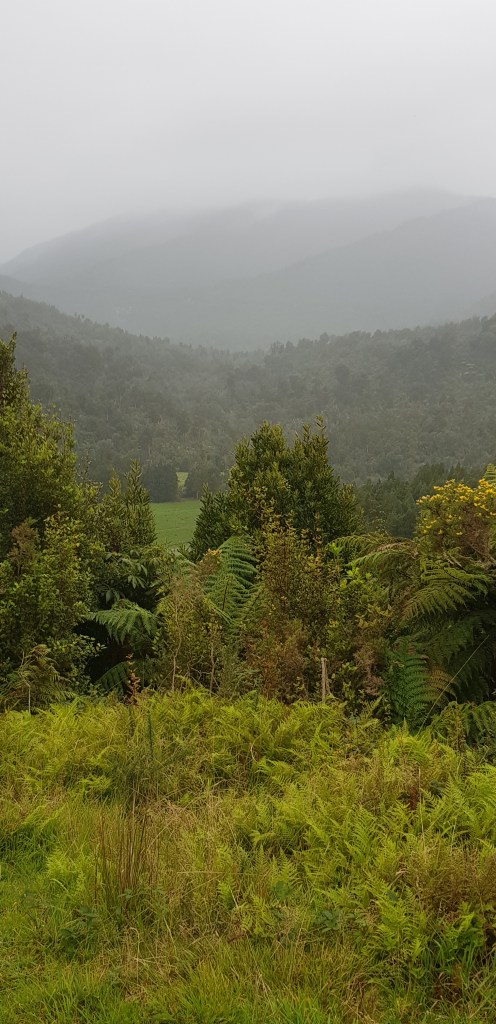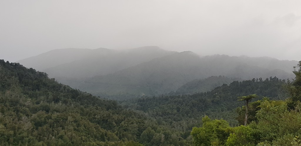 Yesterday, we were above the clouds, today we were below them! The peaks on the Radiant and Glasgow Ranges were shrouded in misty cloud. It was easy to see that it was already drizzly up there and that the rain was on its way to the lowlands. By the time the dogs and I had walked down one side of our hill to the road it was very lightly drizzling. The drizzle got a bit heavier as we walked up the hill, but it wasn’t too bad and quite warm. When I got back home and had put the dogs away and the goats out to graze I checked on Holly. She had got herself in a bit of a state and was running around with her tail in the air and calling out. I caught her and put her into the goat paddock. and that seemed to settle her.