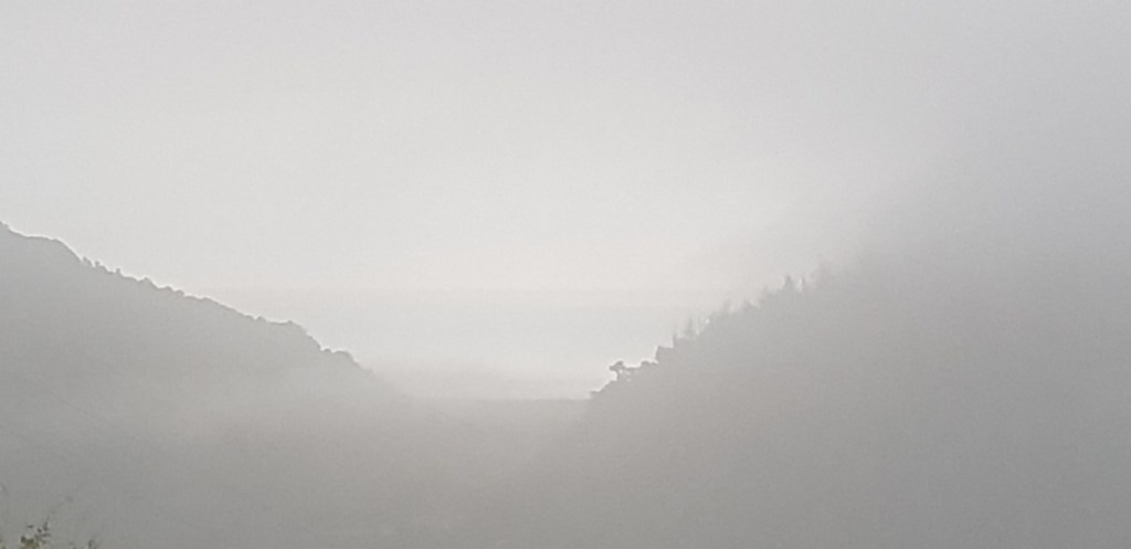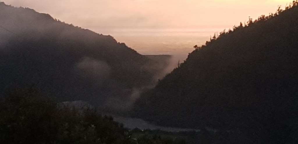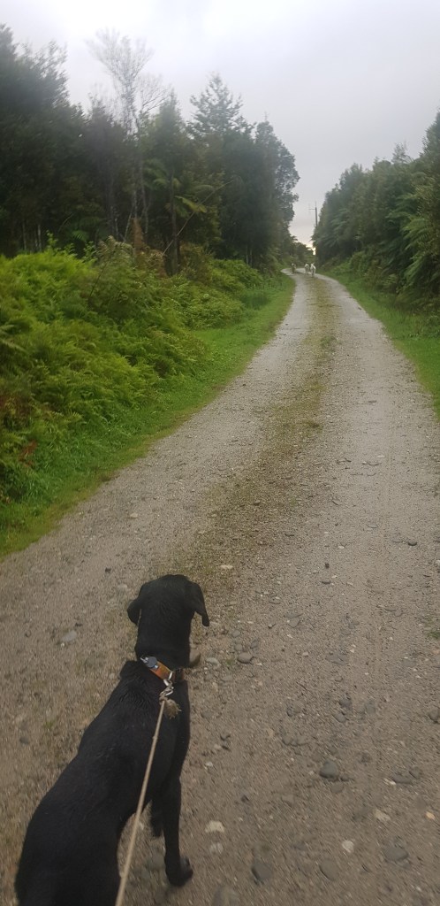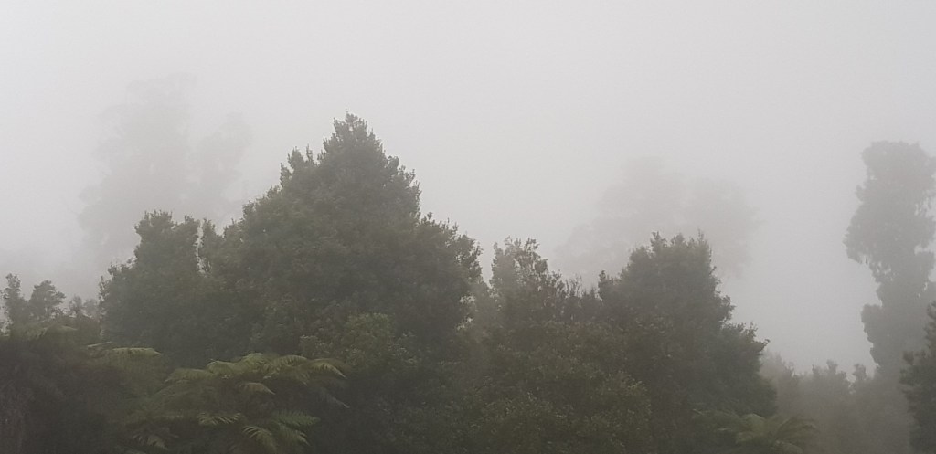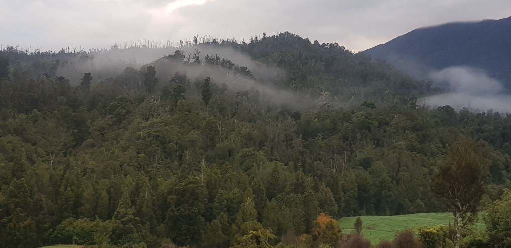 Today was another grey morning. Wispy clouds hung over the hills and dropped deep into the valleys and river beds. The dew hung heavy on the ground, but it wasn’t cold. I think Holly was happy to have her cover off! As I walked down the track I could see that it was raining out on the ranges. The mist was so thick, it was difficult to see the hills and mountains.