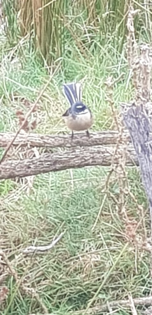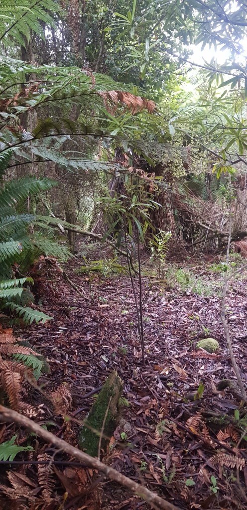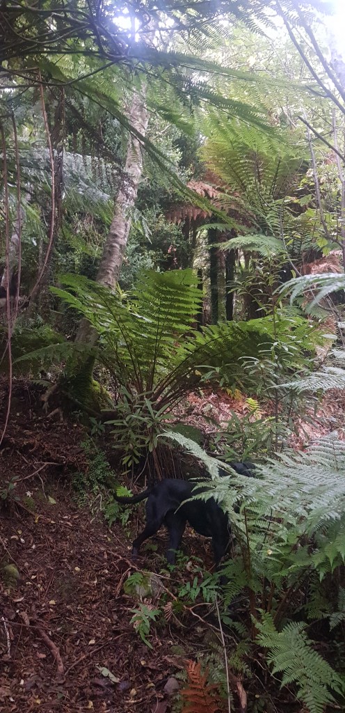 After looking at Laurie’s work, the dogs and I cut through the bush, off the main track and headed up the hill. I was hoping I might see some mushrooms, but did not see one! I did see a beautiful black fantail, but I could not get a photo of it. I don’t think it stayed still for more than half a second! It as very busy, but ever so pretty! It was nice to walk in the bush, I haven’t for a few days due to the rain and wet leaves. I so love the smell of the damp soil and the colour of the wet leaves on the trees and bushes. So clean and fresh – nothing like it! I came across an old fenceline from days gone by. It’s wire netting with barbed wire on top – yuck! I don’t like barbed wire – not one little bit!