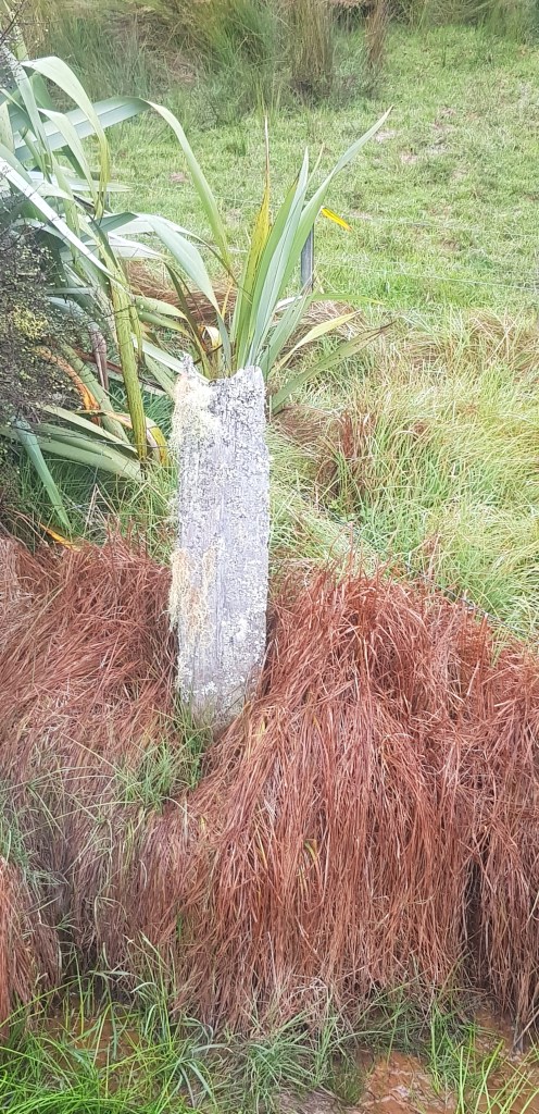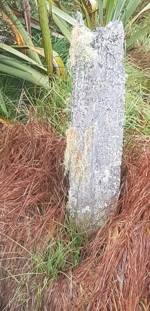 On my morning walk I was accompanied by a chirpy little fantail, (piwakawaka). They always seem to be happy little birds and never cease to lift my spirits and put a smile on my lips. As I walked along the road from one access way to the next My eye was drawn to the old fence that is now falling away.I really like the way moss and lichens grow on the old posts, they are so interesting and no one post looks the same!