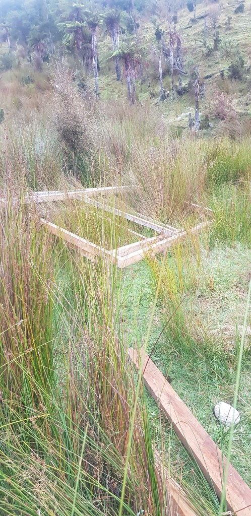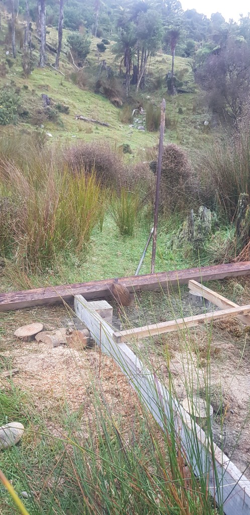 Laurie is building a goat shelter in Rosie’s paddock.(It’s called Rosie’s paddock because a pet sheep that had been in our family for a very long time died there – about 5 years ago.) These days the male goats from our milking goats live there. Ollie is a billy, who I hand raised, he is part boar goat and part feral. Ponga and Brontus are kids from Willow and are both weathers. They are good weed controllers and seem to really go for gorse and blackberry. This is a bonus for us as we have plenty of the latter and don’t use spray to control the weeds. Goats struggle a bit on The Coast due to our high rainfall. They are prone to worms and foot-rot and don’t like the cold and wet. Having a shelter will be a real bonus for them! Laurie has kit-set some of the shelter up at the house and then transported it on our trailer down to the site of the new shelter. Ollie won’t know himself when he goes home!