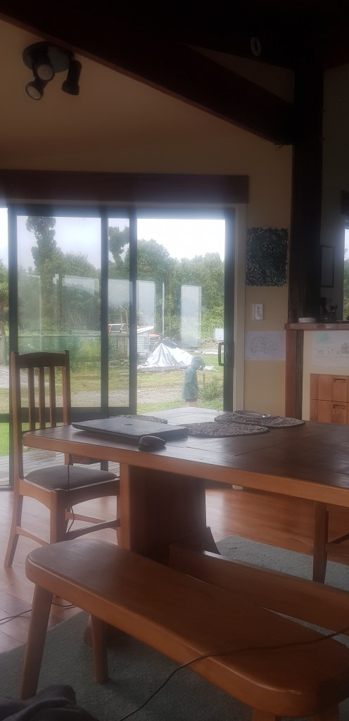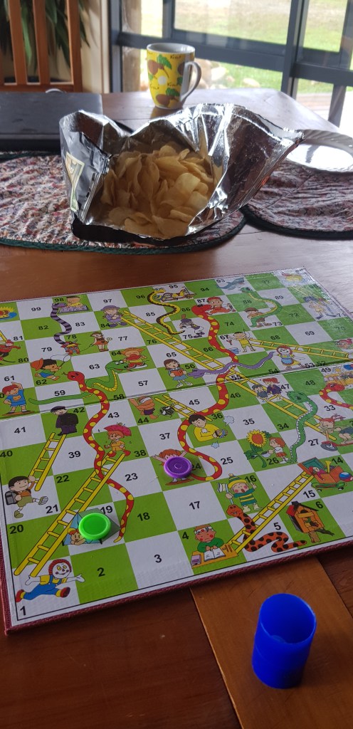 The rain started not long after I got in. I’d fed the chooks and put the goats out for a pick of fresh greens. I didn’t milk Willow this morning. I am going to begin drying her off for the winter, (sigh) that means buying milk again! I did some baking this morning; anzac and chocolae chip biscuits. By this time the rain was getting rather heavy, so Kayden and I cracked open a packet of potato chips and had a game of snakes and ladders. It actually became three games because we won a game each and had to have a championship. Guess who won? 🙂 🙂 🙂