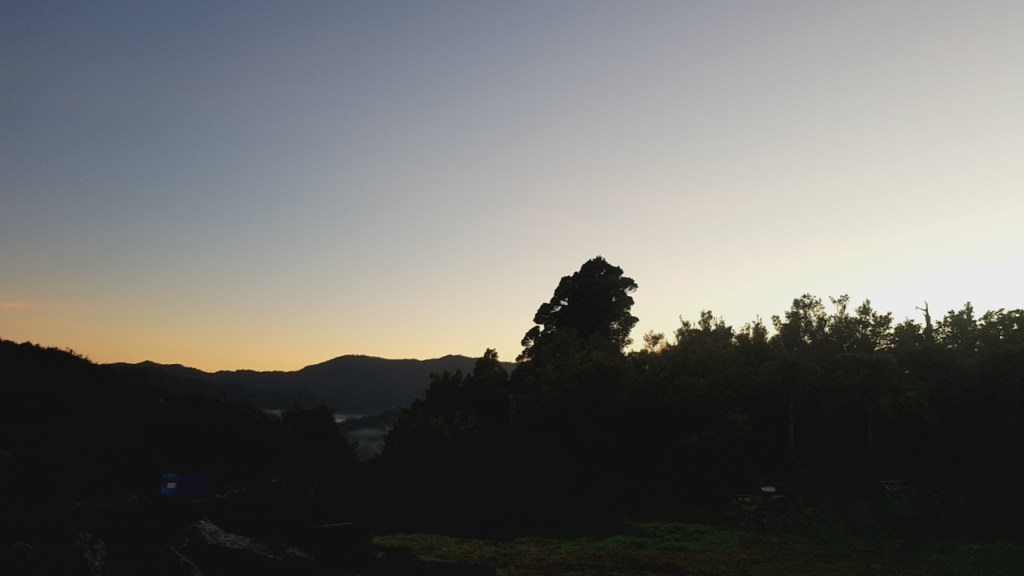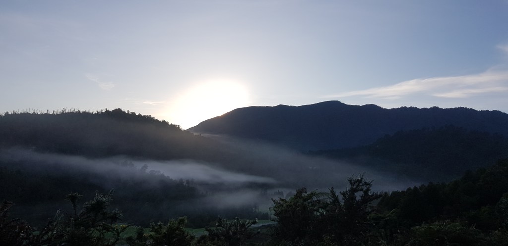 Further up the hill the views were stunning.Perfect colour as the sun was about to appear over the Radiant Range. I never fail to be awed and well … just gob-smacked by the beauty around us.Then once I got up to the top the sun had risen and was shining through the beech trees. To top it all off a lovely little mushroom was poking its head through the dirt. A-maz-ing!