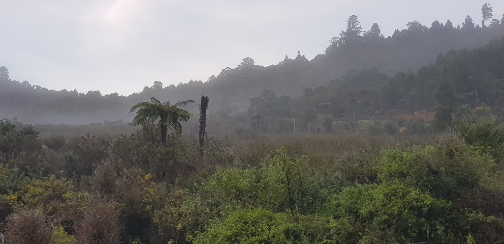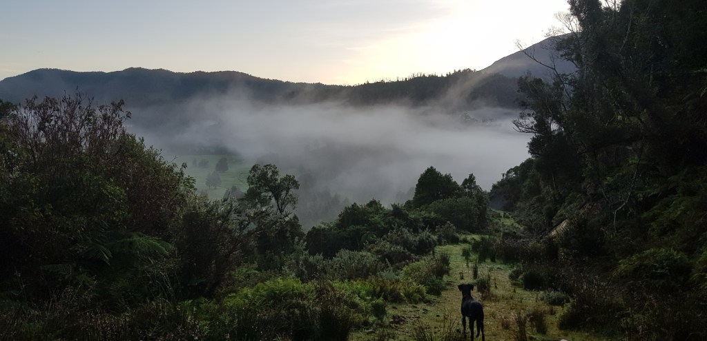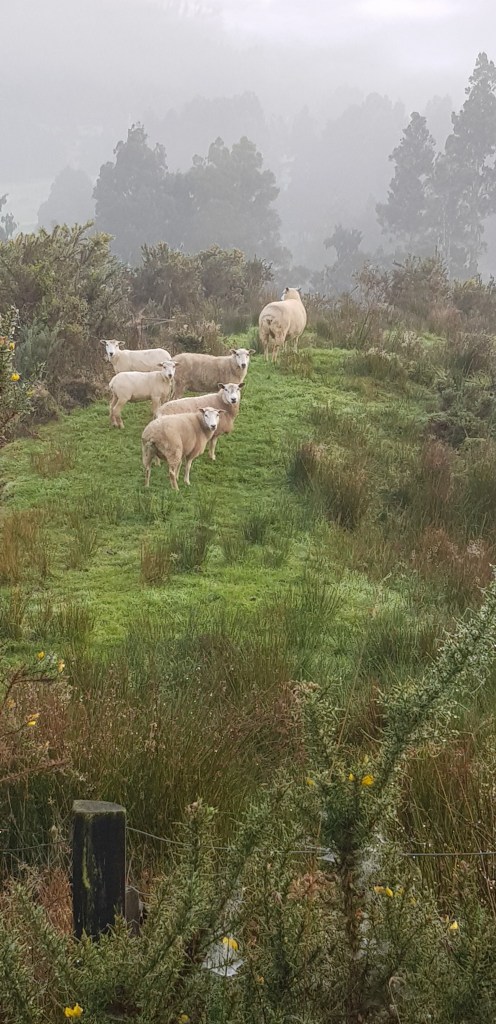 There were lots of scents to excite the dogs and they were as keen as to get moving, running and sniffing here and there! We climbed up a small bank on the side of the track, not for any particular reason – just because we could! I almost ran down the bank – the mood was so joyous and the day full of promise. I found the first eatable mushroom on the side of the track. I didn’t pick it, but am hopeful it’s a sign of things to come! The foggy mist was sitting in the low pockets of the valleys. It muted the view and gave an ethereal mood to the scene before me! The sheep weren’t too pleased when we got to their paddock. One human, four dogs and thirty odd sheep are not much of a social mix!