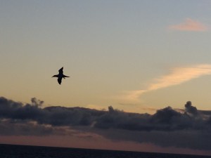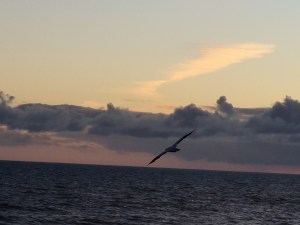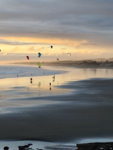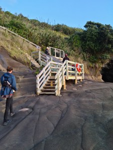 After the visit we went to Murawai Beach. It’s one of those places that I have heard about many times, but never been to. I was not disappointed, it is beautiful. We arrived as the sun was setting for the day. For me, as a Coaster, it was familiar to see the setting sun, yet different in so many ways. At home I often have the beach to myself, especially at this time of the year, but up at Murawai there were a lot of people out and about. In the sea were a group of kite-surfers. Their kites were unbelievable colours that caught the sun as the surfers rode the waves. Some of them stayed in the water until it was almost dark! After parking the car, putting the baby into a front back and organising ourselves, we set off along the walkway. I was instantly fascinated by the cliff walls. You could see the various stages of the area’s formation with the different geological formations. We climbed up several levels of stairs and were high above the sea. The ocean waves were crashing on the rocks below while above us gannets were flying and soaring on the wind’s thermals. I have never seen a gannet up close before. What beautiful birds! With the setting sun as a backdrop, I’m not surprised there were quite a few photographers out taking pictures and hoping for that one special shot.