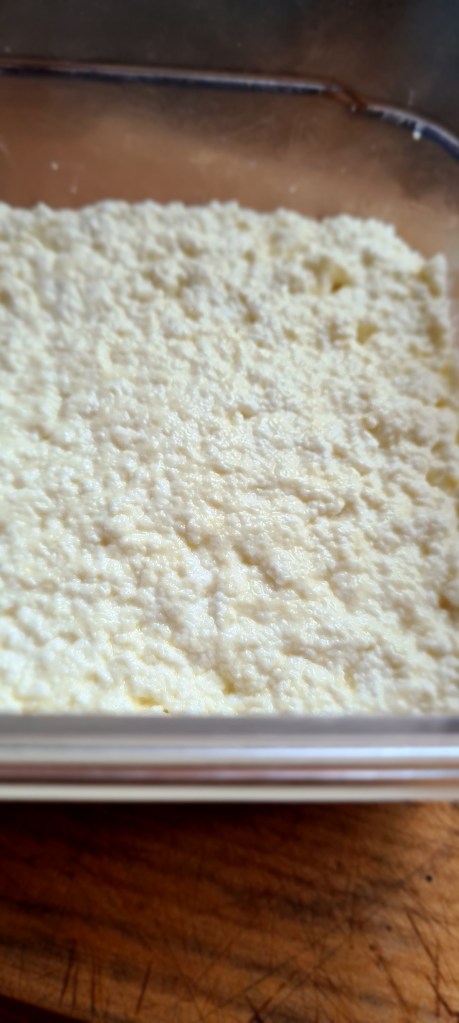 Well, as I’ve been writing this the cream cheese is strained and now has to sit in muslin to drain overnight. The cottage cheese just needs to drain a few more minutes and then I can salt it and put it in a container to go into the fridge. For me it’ll be a shower and finally I’ll join the rest of my family in the land of nod. Good night!